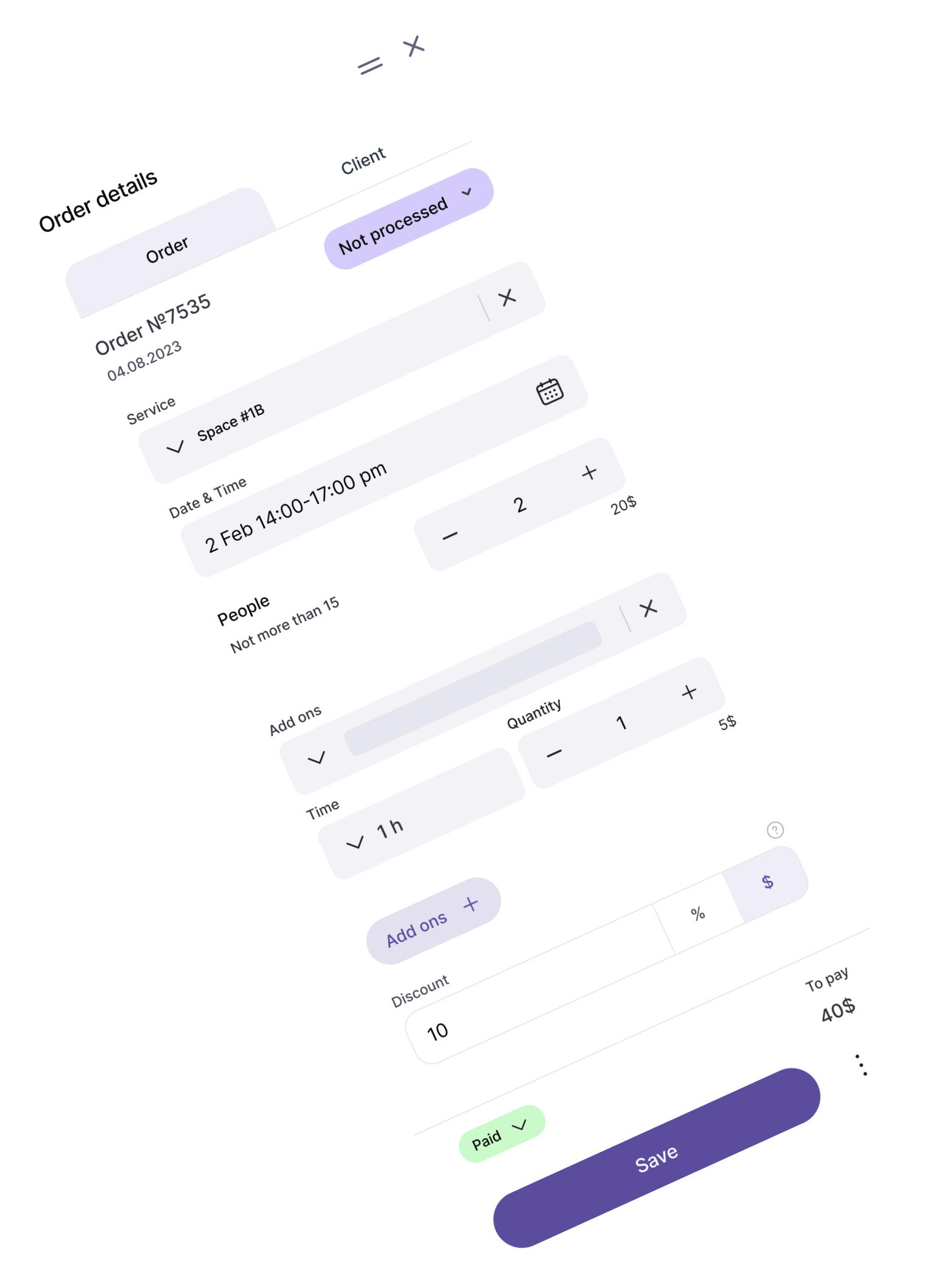 Manage bookings, keep tabs on your client list, track sales, and watch your cash flow — all with ease. No fuss with outside apps or juggling software; Сue has all the tools ready for you